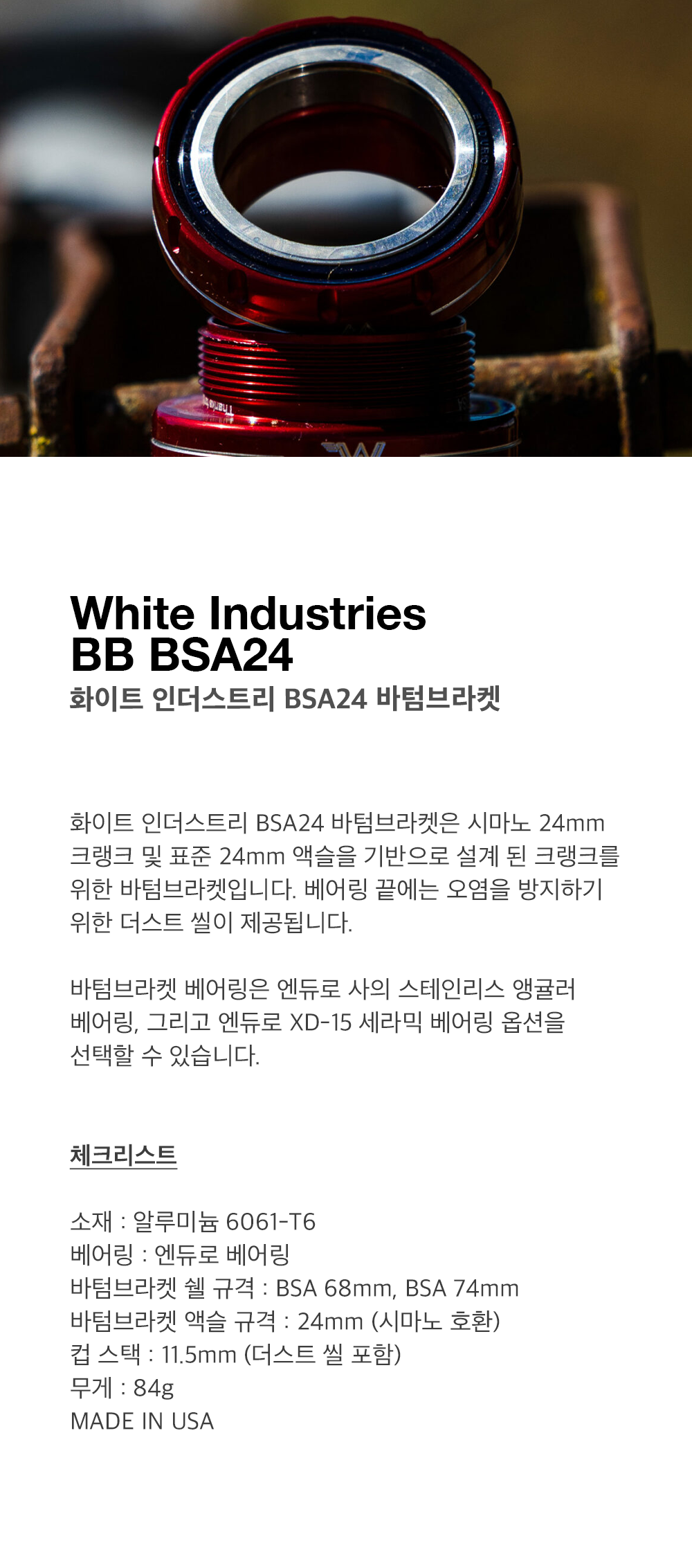 화이트 인더스트리 BSA24 바텀브라켓은 시마노 24mm 크랭크 및 표준 24mm 액슬을 기반으로 설계 된 크랭크를 위한 바텀브라켓입니다. 베어링 끝에는 오염을 방지하기 위한 더스트 씰이 제공됩니다.