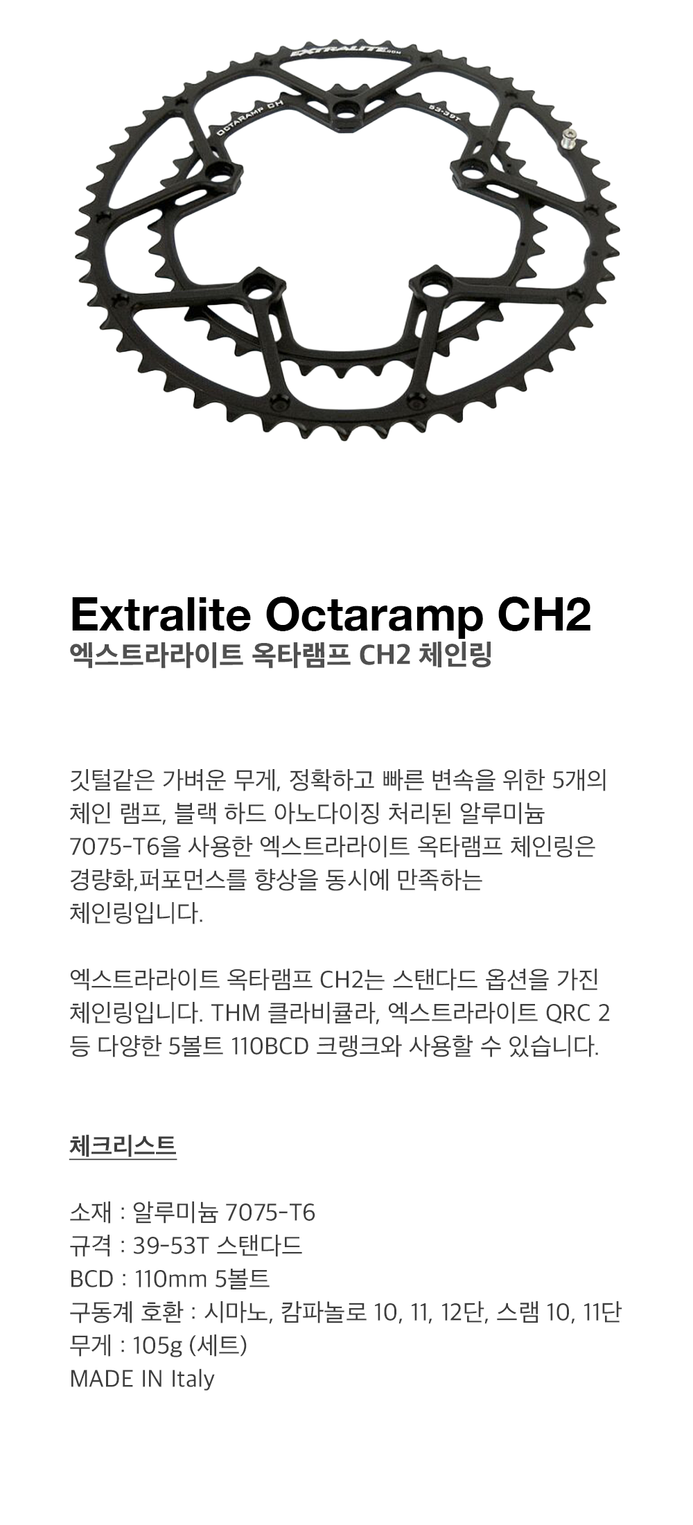 깃털같은 가벼운 무게, 정확하고 빠른 변속을 위한 5개의 체인 램프, 블랙 하드 아노다이징 처리된 알루미늄 T7075-T6을 사용한 엑스트라라이트 옥타램프 체인링은 경량화,퍼포먼스를 향상을 동시에 만족하는 체인링입니다.