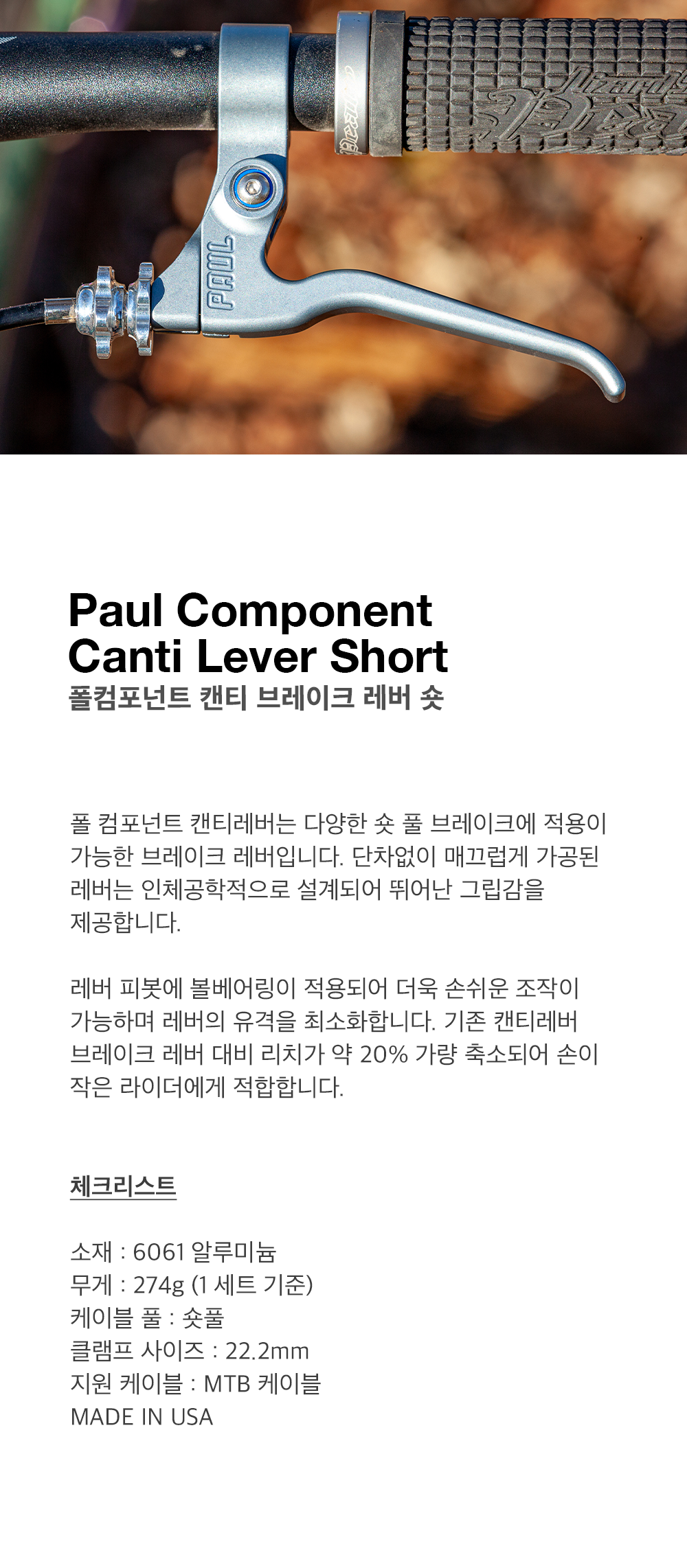 폴컴포넌트 캔티레버는 다양한 숏 풀 브레이크에 적용이 가능한 브레이크 레버입니다. 단차없이 매끄럽게 가공된 레버는 인체공학적으로 설계되어 뛰어난 그립감을 제공합니다.