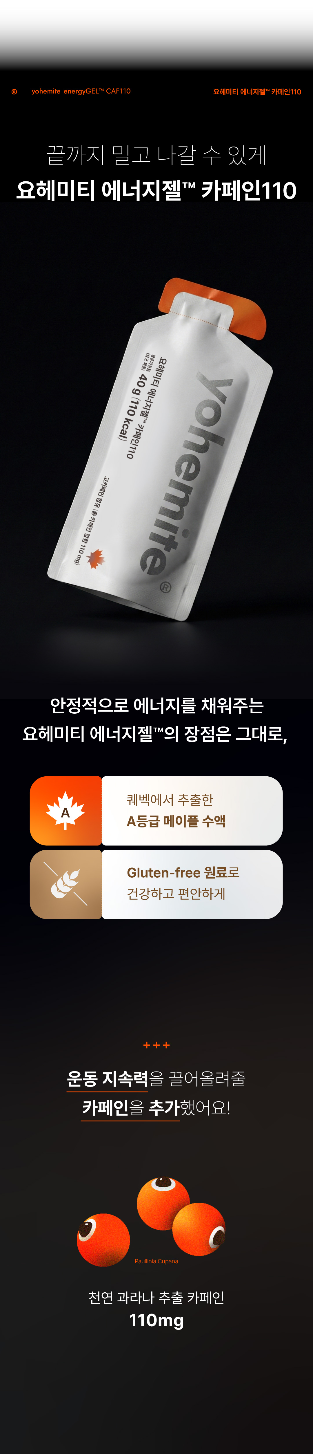 요헤미티 에너지젤 카페인110은 캐나다산 메이플 수액 베이스로 부드러운 목넘김과 빠른 에너지 공급을 동시에 제공하는 스포츠 젤입니다.