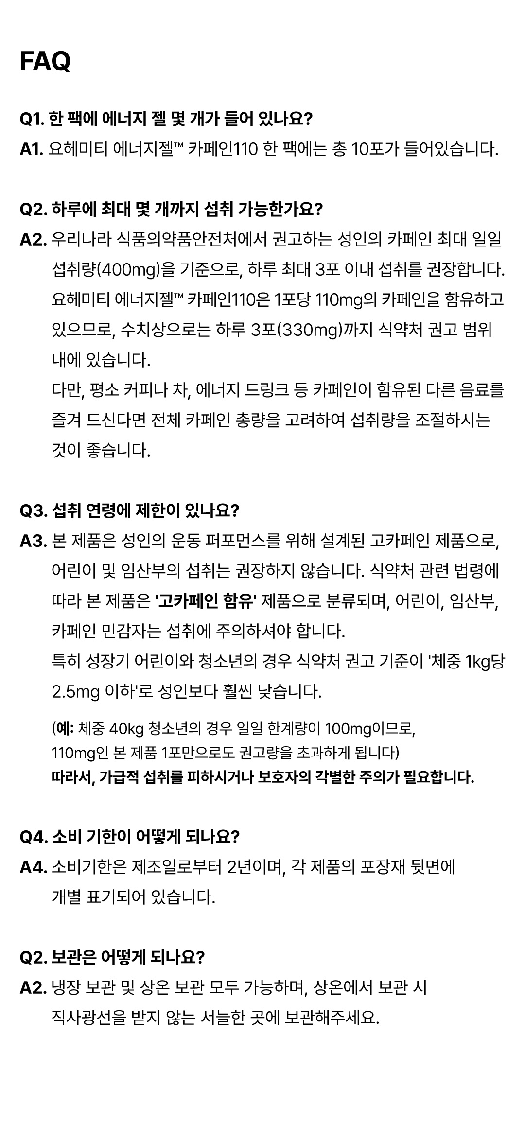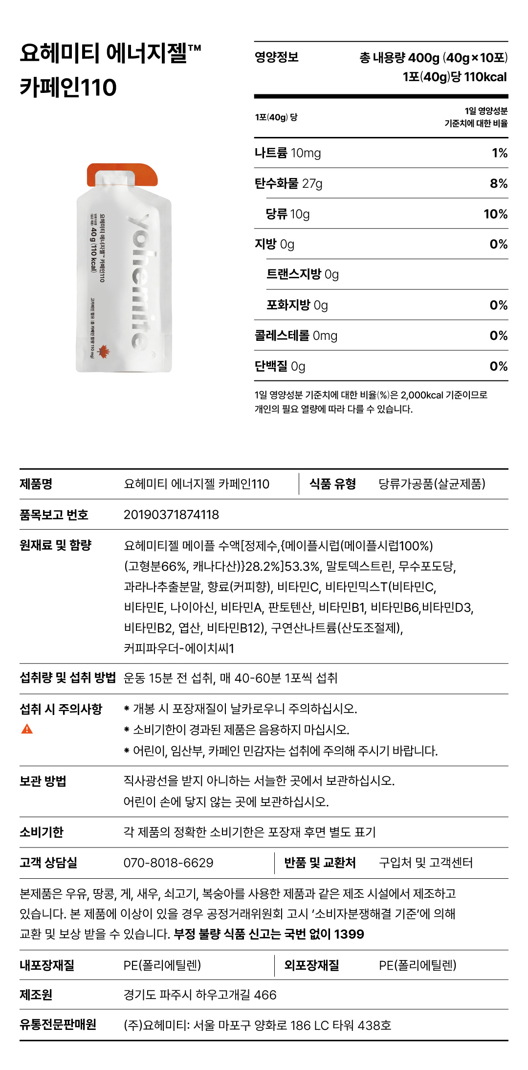 요헤미티 에너지 젤 카페인 110 (1팩 당 10포)
