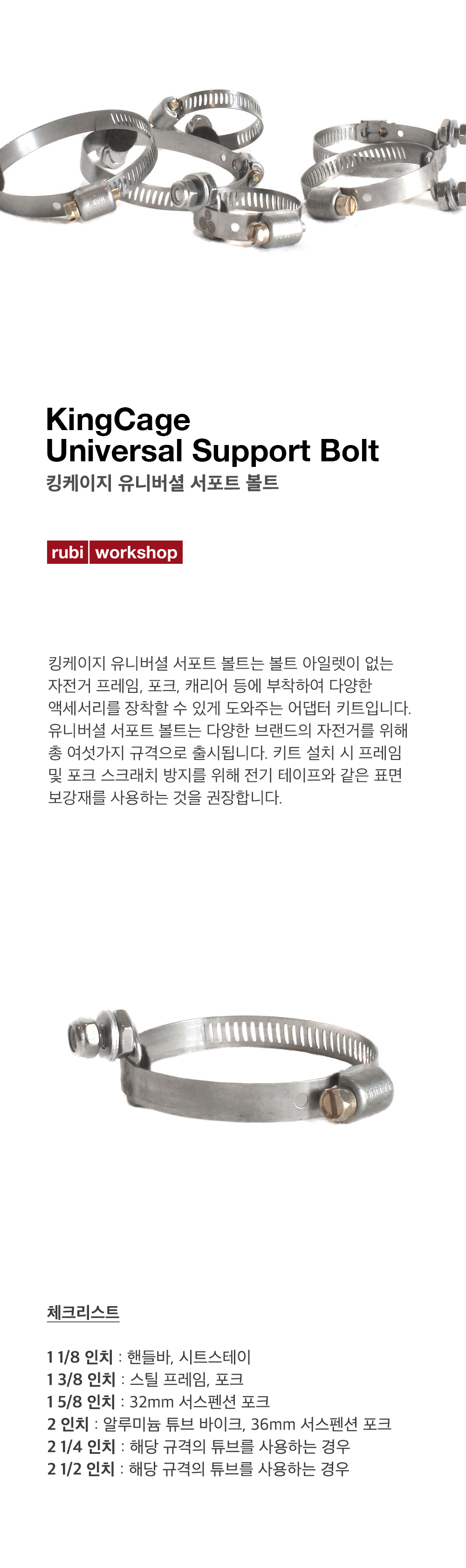 킹케이지 유니버셜 서포트 볼트는 볼트 아일렛이 없는 자전거 프레임, 포크, 캐리어 등에 부착하여 다양한 액세서리를 장착할 수 있게 도와주는 어댑터 키트입니다. 유니버셜 서포트 볼트는 다양한 브랜드의 자전거를 위해 총 여섯가지 규격으로 출시됩니다. 키트 설치 시 프레임 및 포크 스크래치 방지를 위해 전기 테이프와 같은 표면 보강재를 사용하는 것을 권장합니다.