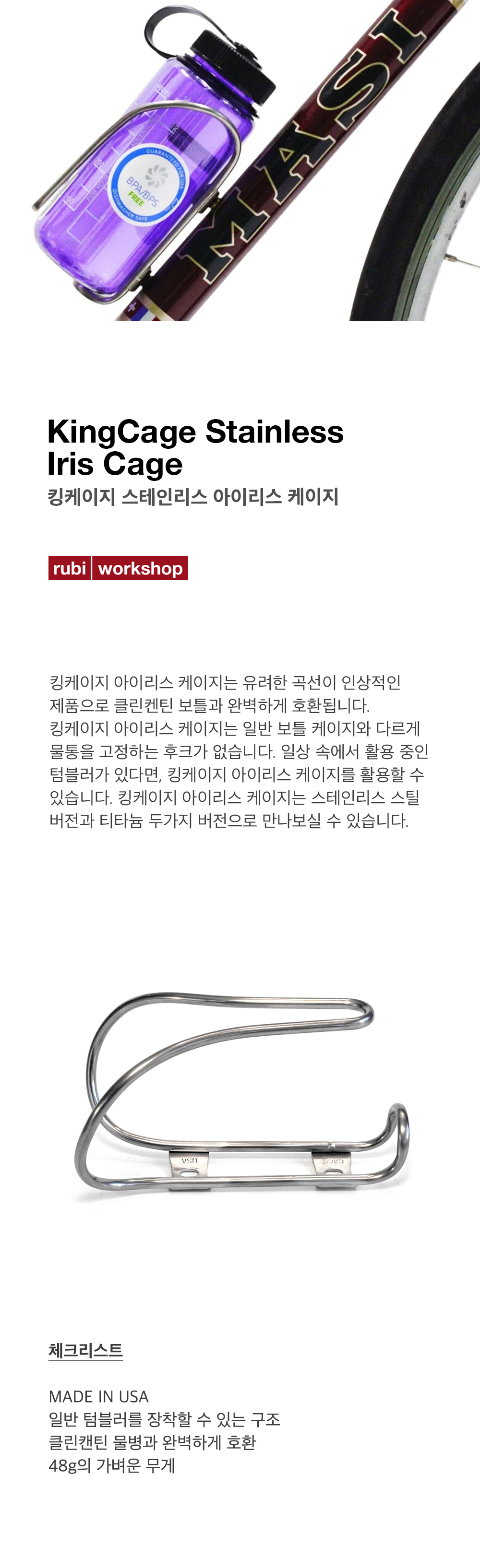 킹케이지 아이리스 케이지는 유려한 곡선이 인상적인 제품으로 클린켄틴 보틀과 완벽하게 호환됩니다. 킹케이지 아이리스 케이지는 일반 보틀 케이지와 다르게 물통을 고정하는 후크가 없습니다. 일상 속에서 활용 중인 텀블러가 있다면, 아이리스 킹케이지를 활용할 수 있습니다.킹케이지 아이리스 케이지는 스테인리스 스틸 버전과 티타늄 두가지 버전으로 만나보실 수 있습니다.