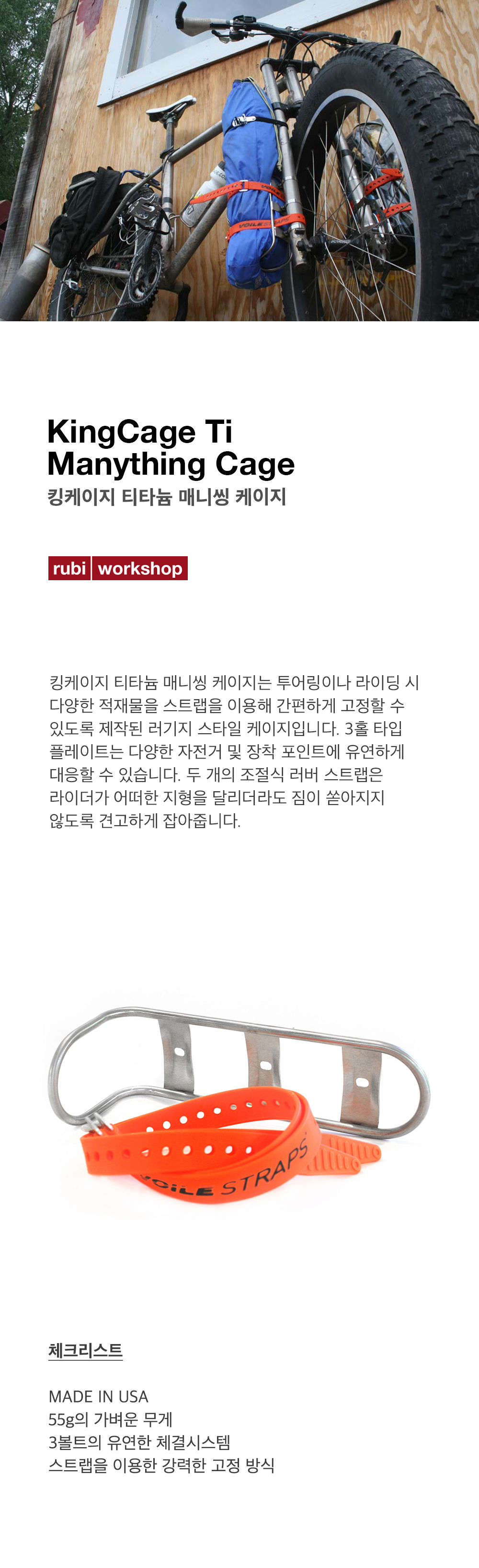 킹케이지 티타늄 매니씽 케이지는 투어링이나 라이딩 시 다양한 적재물을 스트랩을 이용해 간편하게 고정할 수 있도록 제작된 러기지 스타일 케이지입니다. 3홀 타입 플레이트는 다양한 자전거 및 장착 포인트에 유연하게 대응할 수 있습니다. 두 개의 조절식 러버 스트랩은 라이더가 어떠한 지형을 달리더라도 짐이 쏟아지지 않도록 견고하게 잡아줍니다.