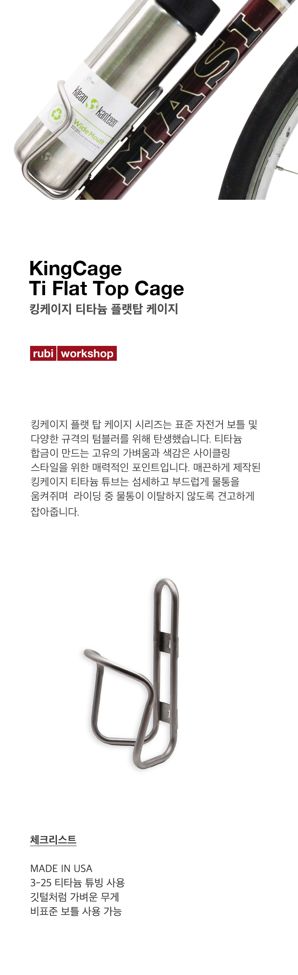 킹케이지 플랫 탑 케이지 시리즈는 표준 자전거 보틀 및 다양한 규격의 텀블러를 위해 탄생했습니다. 티타늄 합금이 만드는 고유의 가벼움과 색감은 사이클링 스타일을 위한 매력적인 포인트입니다. 매끈하게 제작된 킹케이지 티타늄 튜브는 섬세하고 부드럽게 물통을 움켜쥐며 라이딩 중 물통이 이탈하지 않도록 견고하게 잡아줍니다.