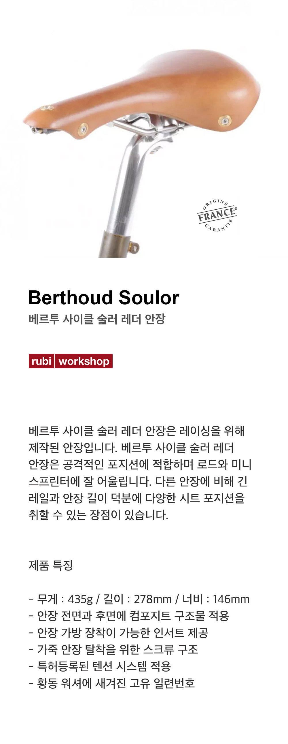베르투 사이클 술러 레더 안장은 레이싱을 위해 제작된 안장입니다. 베르투 사이클 술러 레더 안장은 공격적인 포지션에 적합하며 로드와 미니 스프린터에 잘 어울립니다. 다른 안장에 비해 긴 레일과 안장 길이 덕분에 다양한 시트 포지션을 취할 수 있는 장점이 있습니다.