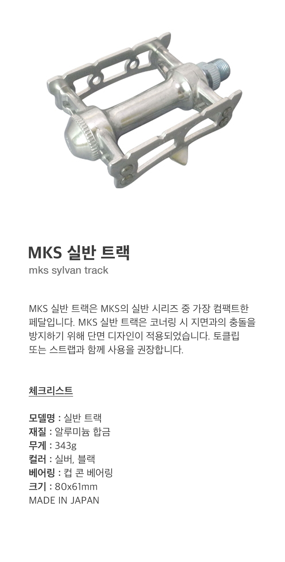 MKS 실반 트랙은 MKS의 실반 시리즈 중 가장 컴팩트한 페달입니다. MKS 실반 트랙은 코너링 시 지면과의 충돌을 방지하기 위해 단면 디자인이 적용되었습니다. 토클립 또는 스트랩과 함께 사용을 권장합니다.