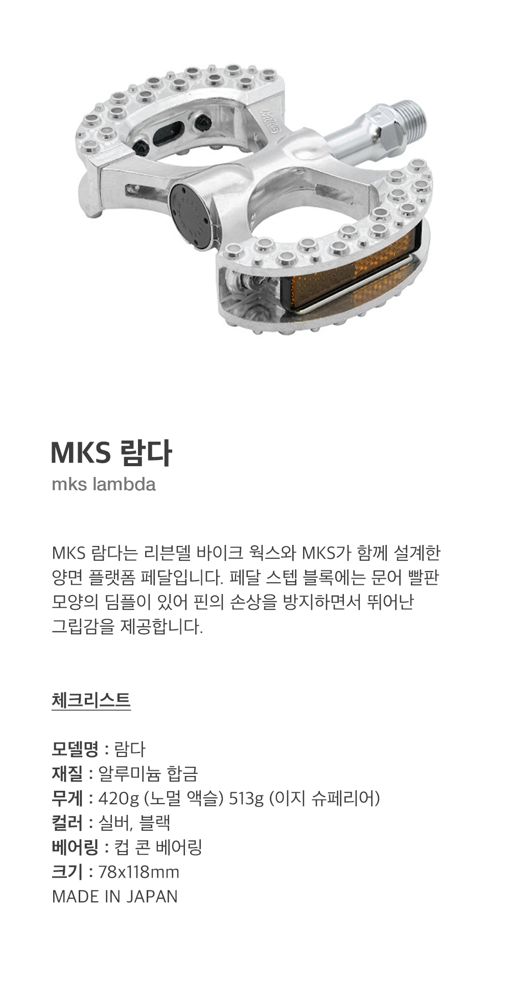 MKS 람다는 리븐델 바이크 웍스와 MKS가 함께 설계한 양면 플랫폼 페달입니다. 페달 스텝 블록에는 문어 빨판 모양의 딤플이 있어 핀의 손상을 방지하면서 뛰어난 그립감을 제공합니다.