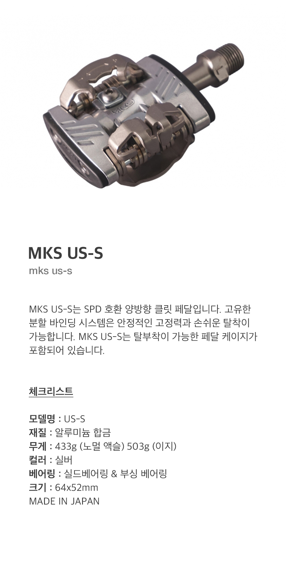 MKS US-S는 SPD 호환 양방향 클릿 페달입니다. 고유한 분할 바인딩 시스템은 안정적인 고정력과 손쉬운 탈착이 가능합니다. MKS US-S는 탈부착이 가능한 페달 케이지가 포함되어 있습니다.