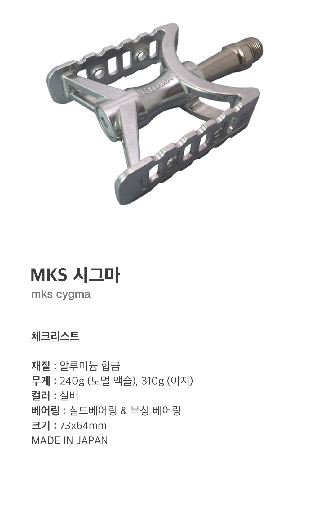 시그마는 MKS에서 두 번째로 가벼운 페달로, 압출 및 CNC 가공된 MKS 컴펙트 보다 한 쌍당 7g의 차이가 있습니다. 컴펙트와 마찬가지로 시그마는 신뢰성을 위해 실드 베어링과 부싱 베어링 시스템을 기반으로 제작되었습니다. 시그마는 컴팩트한 양면 일체형 알루미늄 페달로, 토클립과 리플렉터를 장착할 수 있습니다. 도심 라이딩과 가벼운 투어링에 적합한 페달로 추천드립니다.