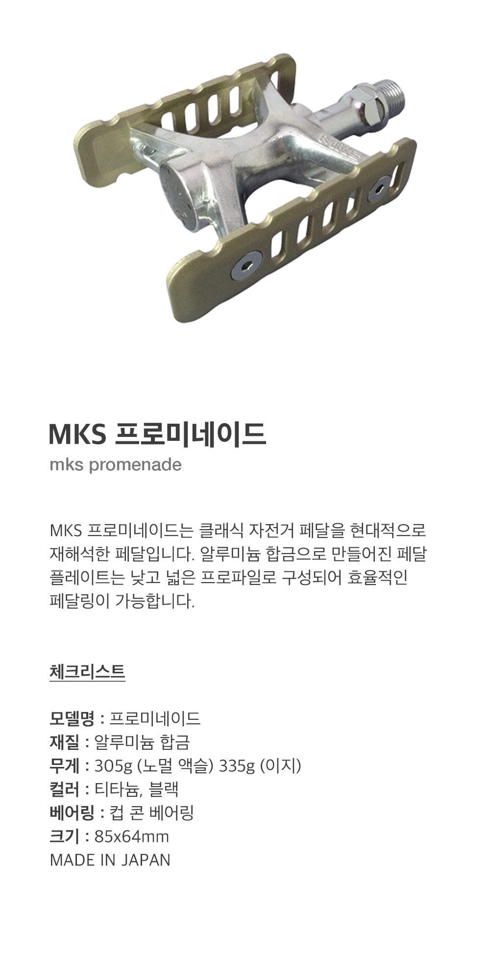 MKS 프로미네이드는 클래식 자전거 페달을 현대적으로 재해석한 페달입니다. 알루미늄 합금으로 만들어진 페달 플레이트는 낮고 넓은 프로파일로 구성되어 효율적인 페달링이 가능합니다.
