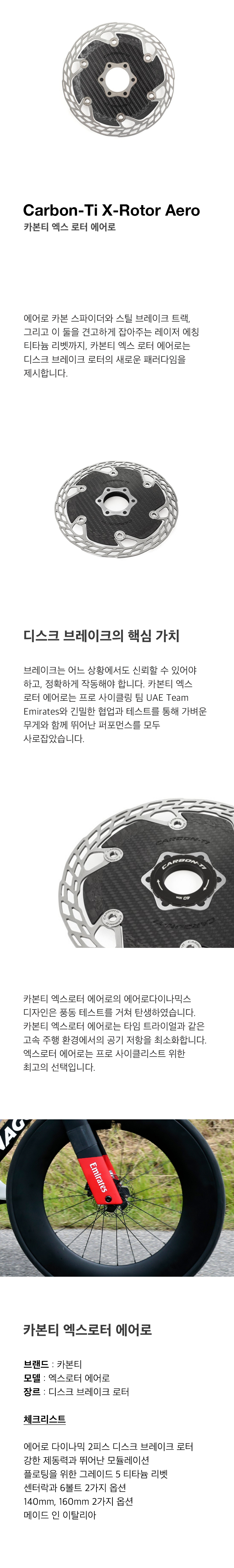 에어로 카본 스파이더와 스틸 브레이크 트랙, 그리고 이 둘을 견고하게 잡아주는 레이저 에칭 티타늄 리벳까지, 카본티 엑스로터 에어로는 디스크 브레이크 로터의 새로운 패러다임을 제시합니다.