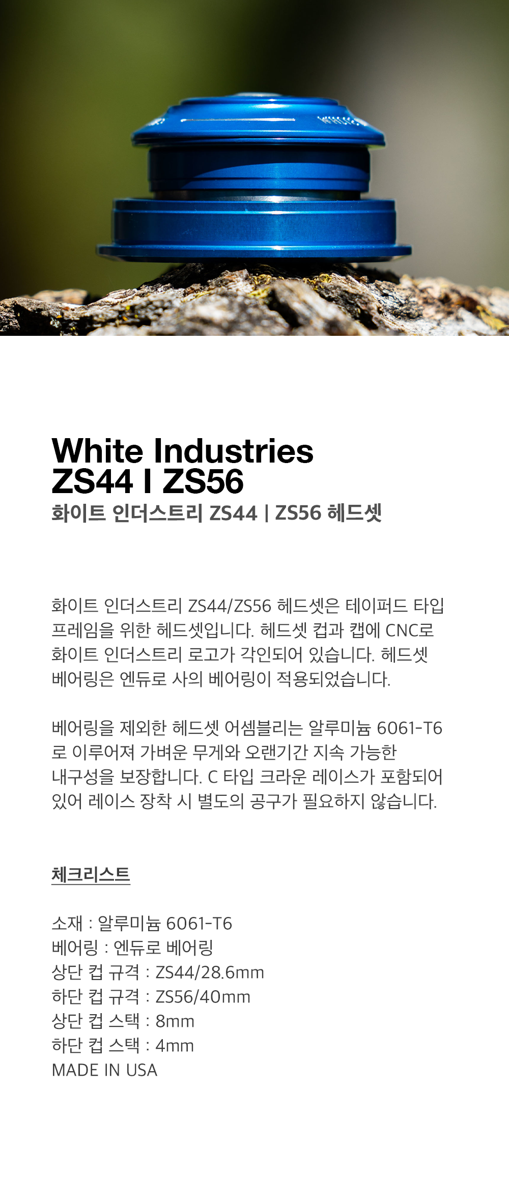 화이트 인더스트리 ZS44/ZS56 헤드셋은 테이퍼드 타입 프레임을 위한 헤드셋입니다. 헤드셋 컵과 캡에 CNC로 화이트 인더스트리 로고가 각인되어 있습니다. 헤드셋 베어링은 엔듀로 사의 베어링이 적용되었습니다.