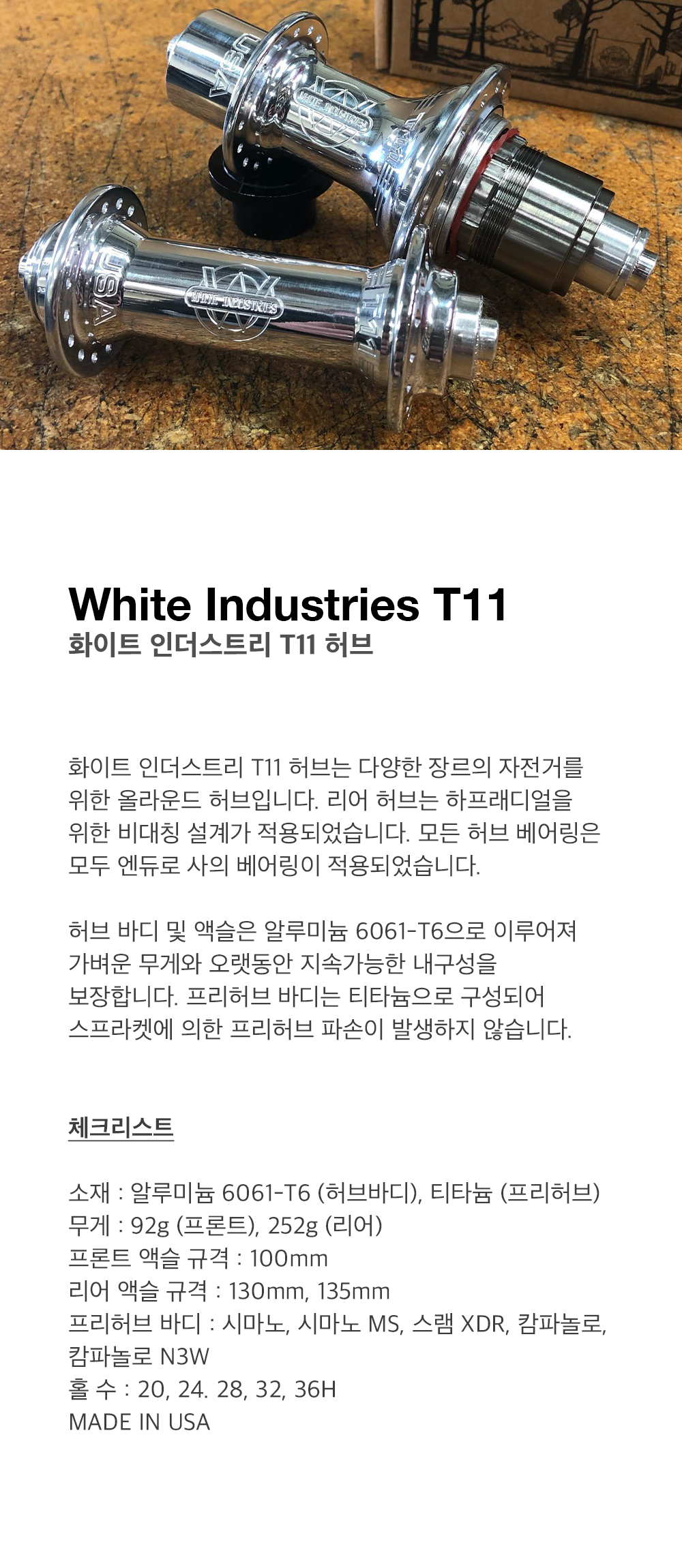 화이트 인더스트리 T11 림 브레이크 허브는 로드바이크를 위한 허브입니다. 리어 허브는 하프래디얼을 위한 비대칭 설계가 적용되었습니다. 모든 허브 베어링은 모두 엔듀로 사의 베어링이 적용되었습니다.