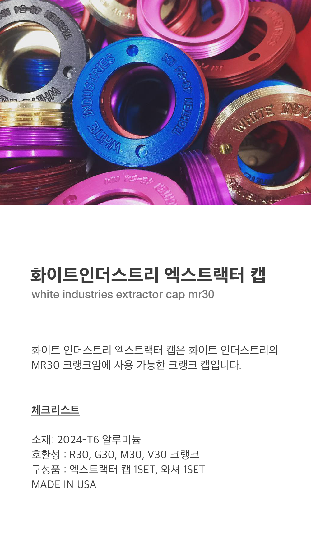 화이트 인더스트리 엑스트랙터 캡은 화이트 인더스트리의 MR30 크랭크암에 사용 가능한 크랭크 캡입니다.