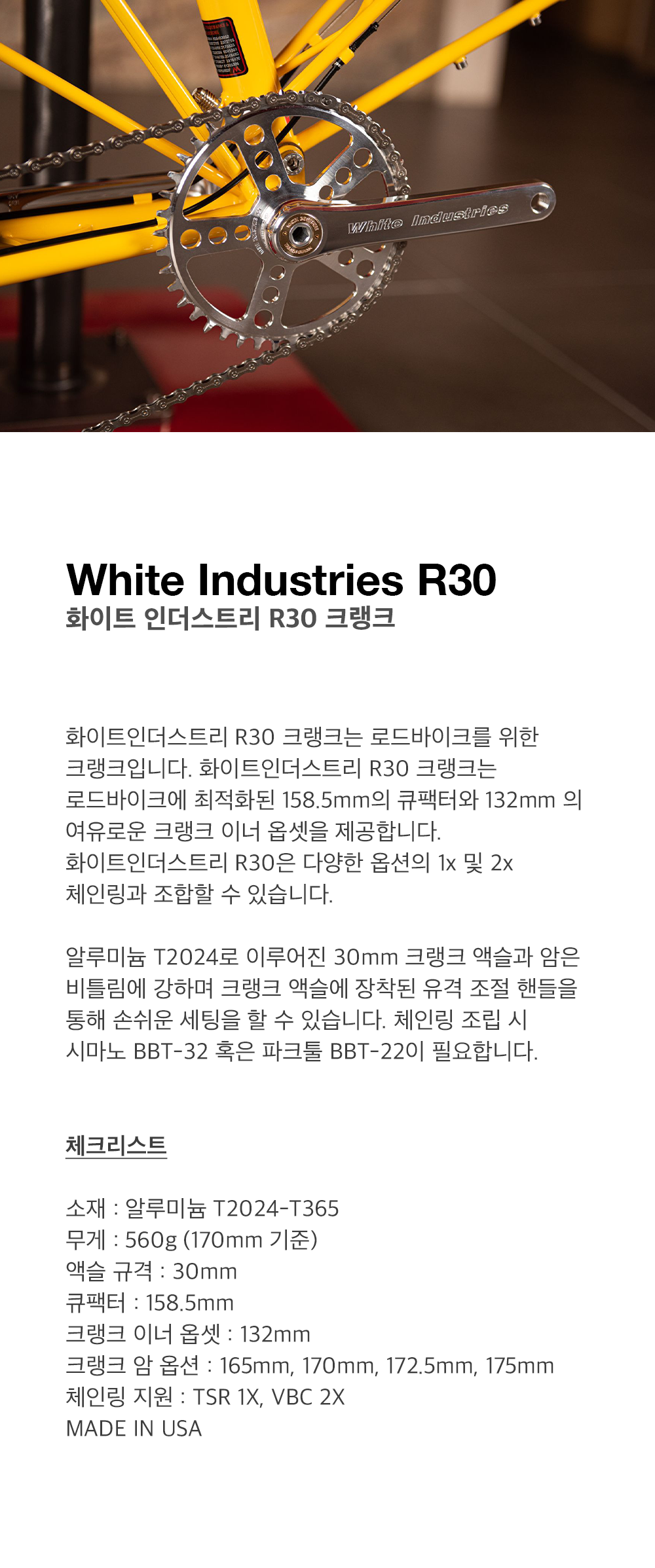 화이트인더스트리 R30 크랭크는 로드바이크를 위한 크랭크입니다. 화이트인더스트리 R30 크랭크는 로드바이크에 최적화된 158.5mm의 큐팩터와 132mm 의 여유로운 크랭크 이너 옵셋을 제공합니다. 화이트인더스트리 R30은 다양한 옵션의 1x 및 2x 체인링과 조합할 수 있습니다.