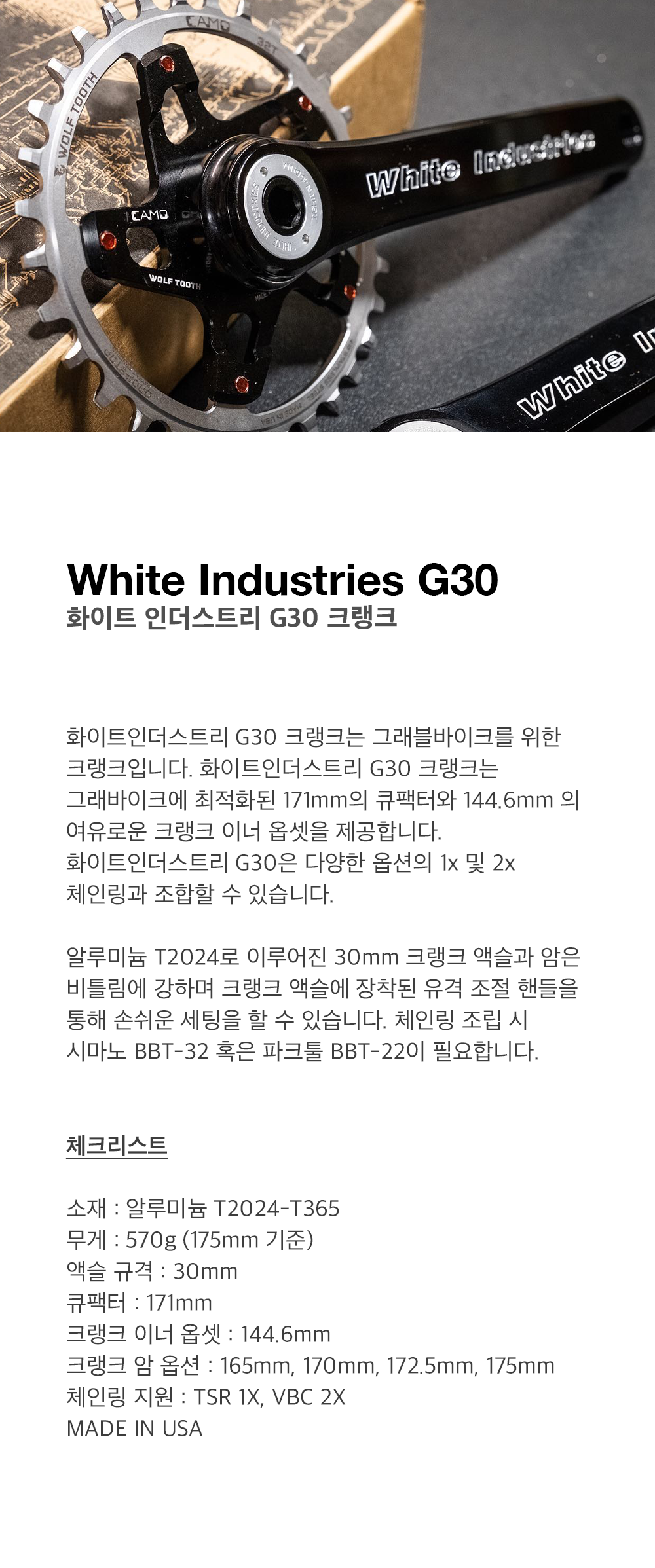 화이트인더스트리 G30 크랭크는 그래블바이크를 위한 크랭크입니다. 화이트인더스트리 G30 크랭크는 그래바이크에 최적화된 171mm의 큐팩터와 144.6mm 의 여유로운 크랭크 이너 옵셋을 제공합니다. 화이트인더스트리 G30은 다양한 옵션의 1x 및 2x 체인링과 조합할 수 있습니다.