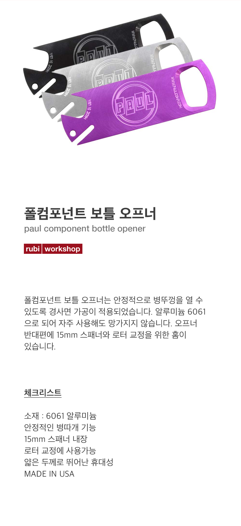 폴 컴포넌트 보틀 오프너는 안정적으로 병뚜껑을 열 수 있도록 경사면 가공이 적용되었습니다. 알루미늄 6061으로 되어 자주 사용해도 망가지지 않습니다. 오프너 반대편에 15mm 스패너와 로터 교정을 위한 홈이 있습니다.