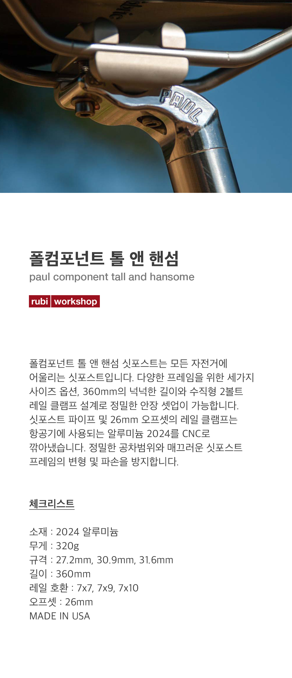 폴 컴포넌트 톨 앤 핸섬 싯포스트는 모든 자전거에 어울리는 싯포스트입니다. 다양한 프레임을 위한 세가지 사이즈 옵션, 360mm의 넉넉한 길이와 수직형 2볼트 레일 클램프 설계로 정밀한 안장 셋업이 가능합니다.