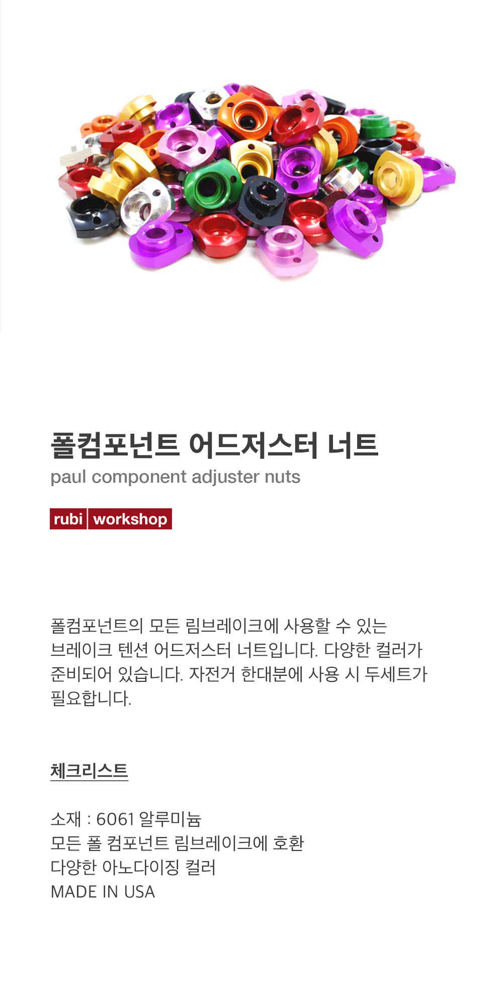 폴 컴포넌트의 모든 림브레이크에 사용할 수 있는 브레이크 텐션 어드저스터 너트입니다. 다양한 컬러가 준비되어 있습니다. 자전거 한대분에 사용 시 두세트가 필요합니다.