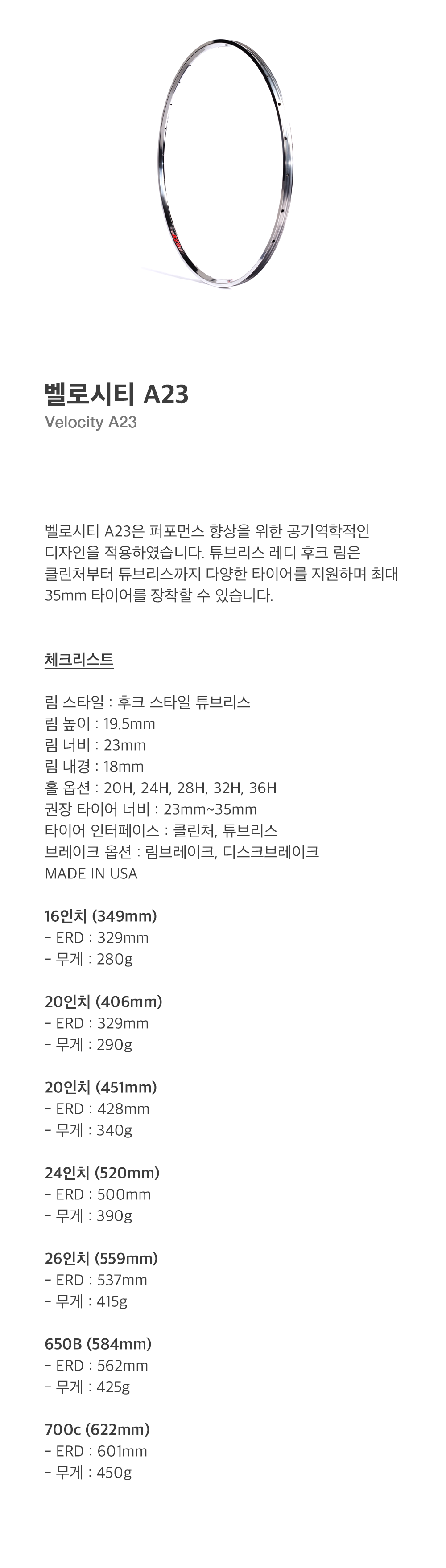 벨로시티 A23은 퍼포먼스 향상을 위한 공기역학적인 디자인을 적용하였습니다. 튜브리스 레디 후크 림은 클린처부터 튜브리스까지 다양한 타이어를 지원하며 최대 35mm 타이어를 장착할 수 있습니다.