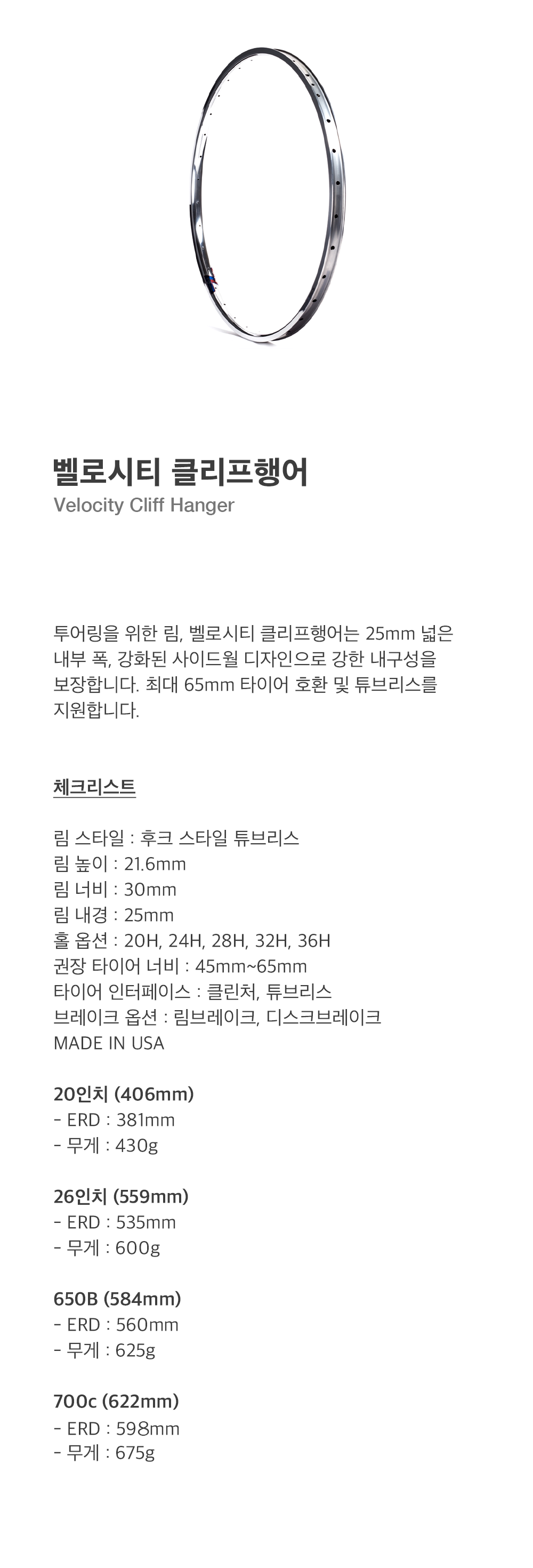 투어링을 위한 림, 벨로시티 클리프행어는 25mm 넓은 내부 폭, 강화된 사이드월 디자인으로 강한 내구성을 보장합니다. 최대 65mm 타이어 호환 및 튜브리스를 지원합니다.