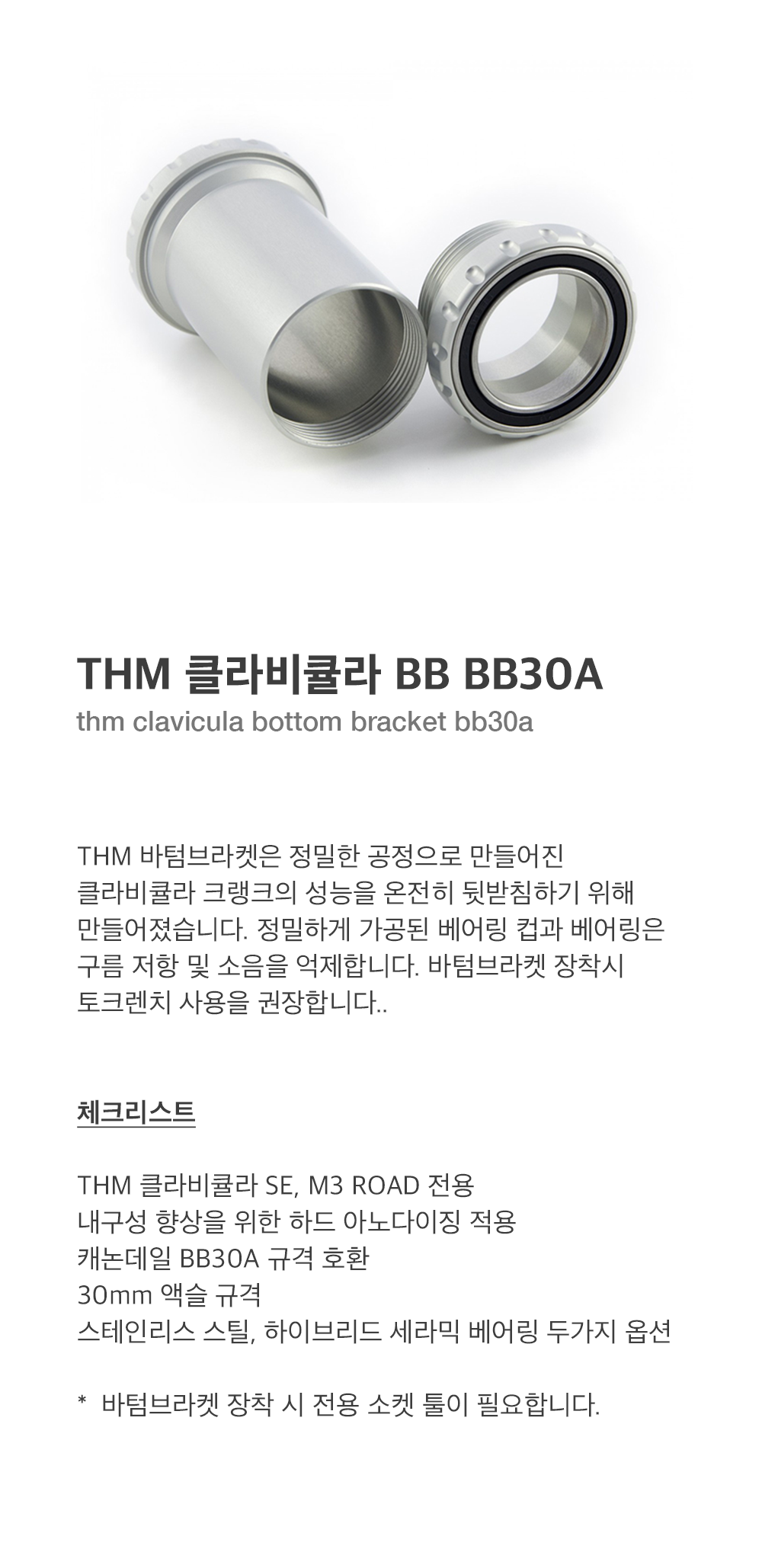 THM 바텀브라켓은 정밀한 공정으로 만들어진 클라비큘라 크랭크의 성능을 온전히 뒷받침하기 위해 만들어졌습니다. 정밀하게 가공된 베어링 컵과 베어링은 구름 저항 및 소음을 억제합니다. 바텀브라켓 장착시 토크렌치 사용을 권장합니다.