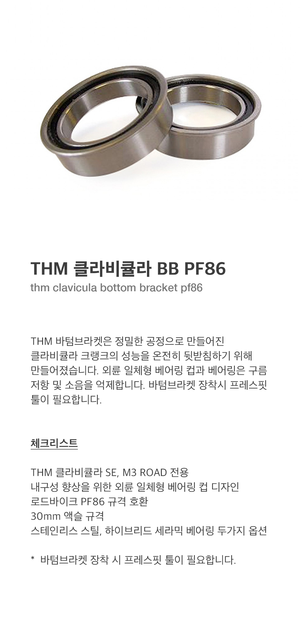 THM 바텀브라켓은 정밀한 공정으로 만들어진 클라비큘라 크랭크의 성능을 온전히 뒷받침하기 위해 만들어졌습니다. 정밀하게 가공된 베어링 컵과 베어링은 구름 저항 및 소음을 억제합니다. 바텀브라켓 장착시 토크렌치 사용을 권장합니다.