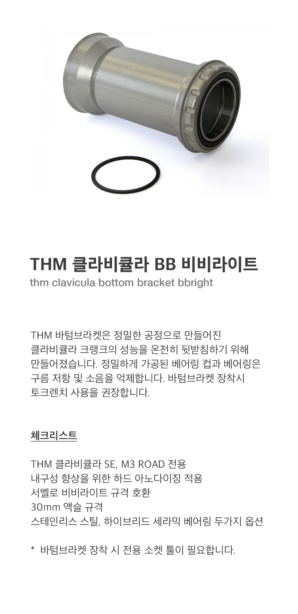 THM 바텀브라켓은 정밀한 공정으로 만들어진 클라비큘라 크랭크의 성능을 온전히 뒷받침하기 위해 만들어졌습니다. 정밀하게 가공된 베어링 컵과 베어링은 구름 저항 및 소음을 억제합니다. 바텀브라켓 장착시 토크렌치 사용을 권장합니다.