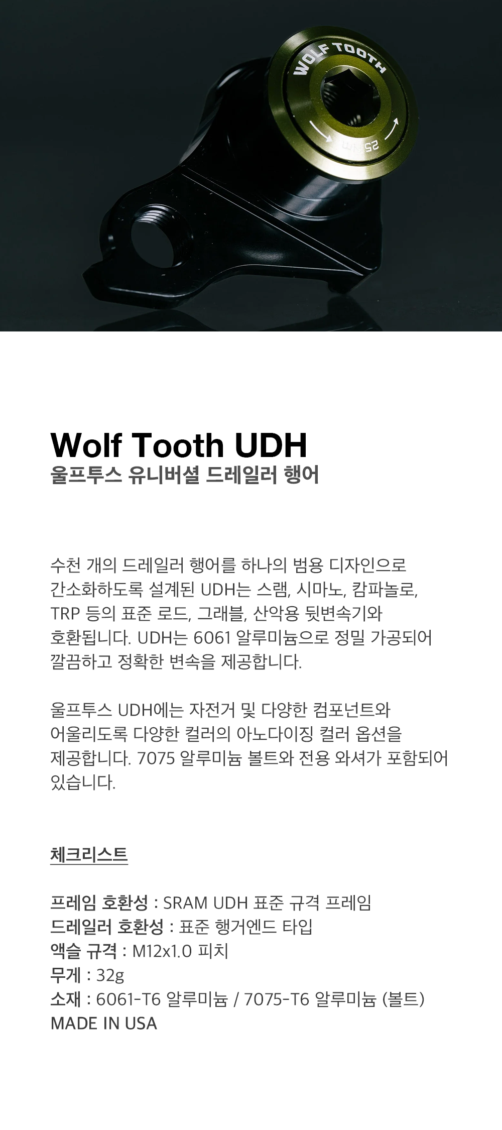 수천 개의 드레일러 행어를 하나의 범용 디자인으로 간소화하도록 설계된 UDH는 스램, 시마노, 캄파놀로, TRP 등의 표준 로드, 그래블, 산악용 뒷변속기와 호환됩니다. UDH는 6061 알루미늄으로 정밀 가공되어 깔끔하고 정확한 변속을 제공합니다.